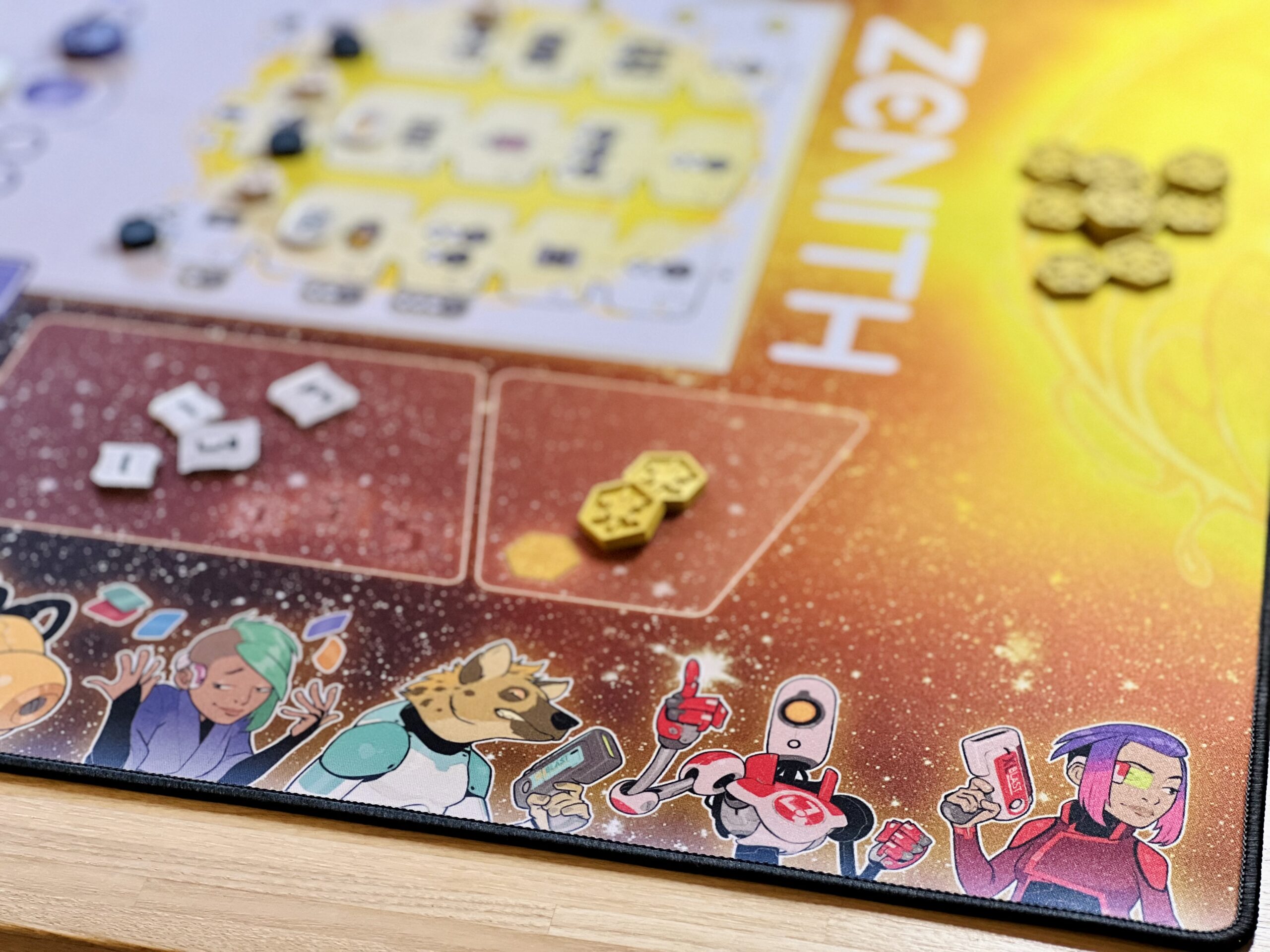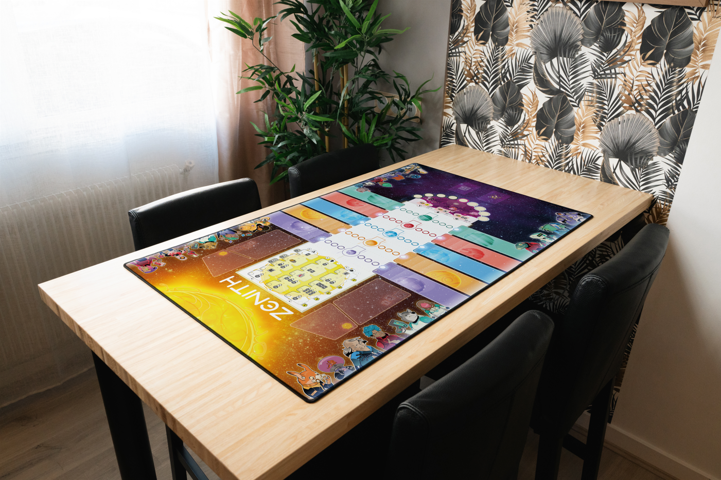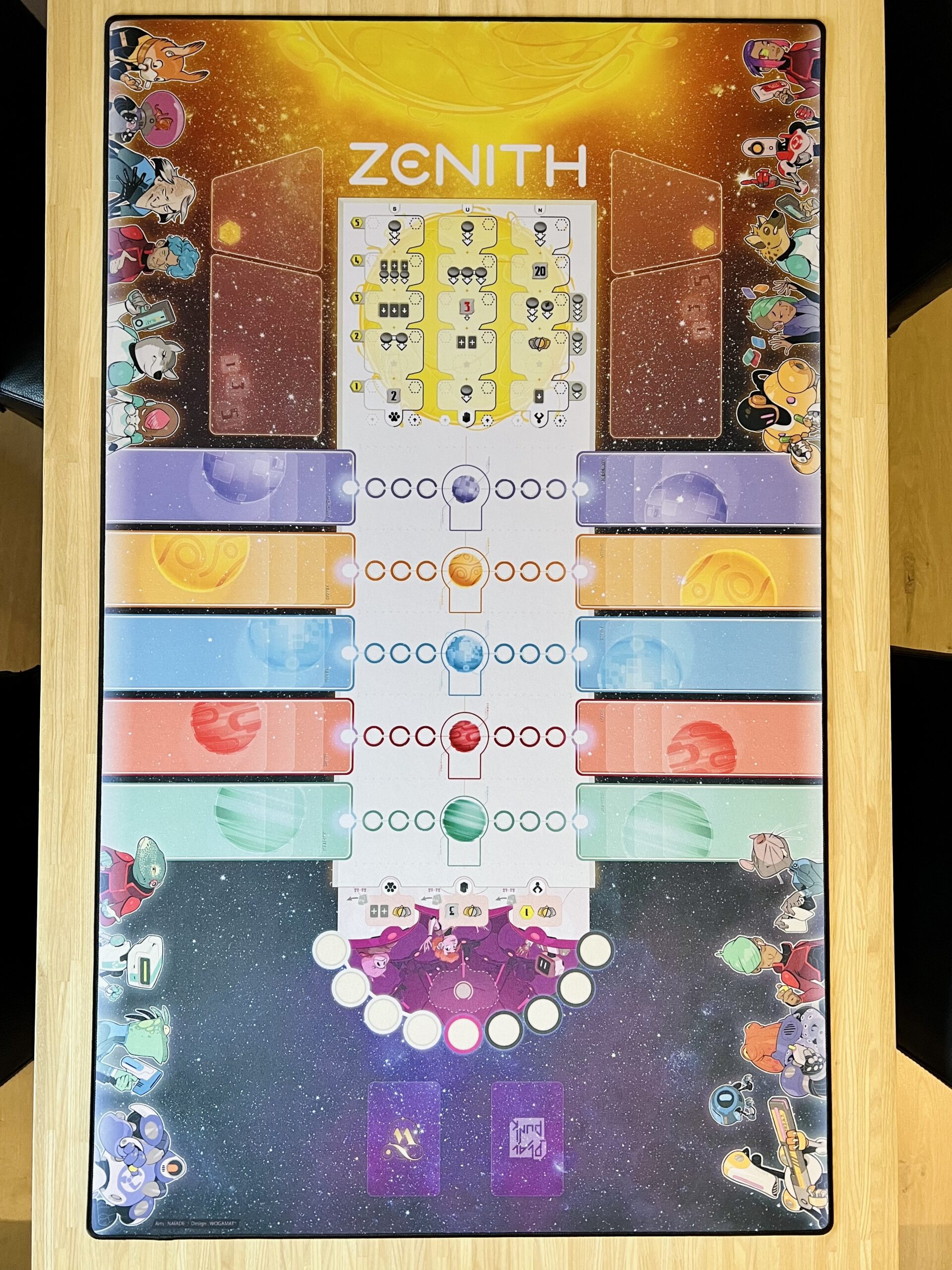 Portée par l’envie de rendre l’expérience de jeu toujours plus intense et immersive, Wogamat s’associe à PlayPunk pour offrir aux joueurs et joueuses de Zénith des parties augmentées : sur un fond stellaire, le plateau de jeu est éclatant, prolongé de chaque côté par des pistes colorées pour poser clairement vos agents par planète. Chaque élément épouse parfaitement l’emplacement qui lui est réservé : cartes, jetons, crédits, zénithium…